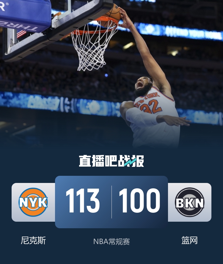 上半场,两队开场便陷入缠斗,比分始终紧咬,克洛尼高效输出,布伦森连中三分迅速回应,次节克洛尼连投带罚继续拿分,但此后篮网突然哑火,尼克斯攻防发力打出11-0的攻击波确立两位数优势,篮网连中三分止血,半场战罢尼克斯51-48领先篮网。下半场,尼克斯火力全开,唐斯连投带罚拿分,帮助球队再获两位数优势,末节两队围绕10分分差展开激烈争夺,篮网后劲不足,尼克斯持续发力将分差拉开到19分,篮网换下主力投子认负。最终,尼克斯113-100轻取篮网,客场过关。