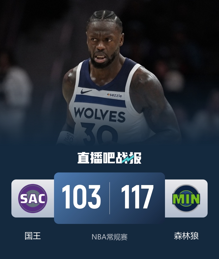 12月15日讯 NBA常规赛,森林狼今日迎战国王,前者上场比赛战胜勇士,后者则是遭遇两连败,此役爱德华兹、康利、小萨和尤班克斯等人缺战。