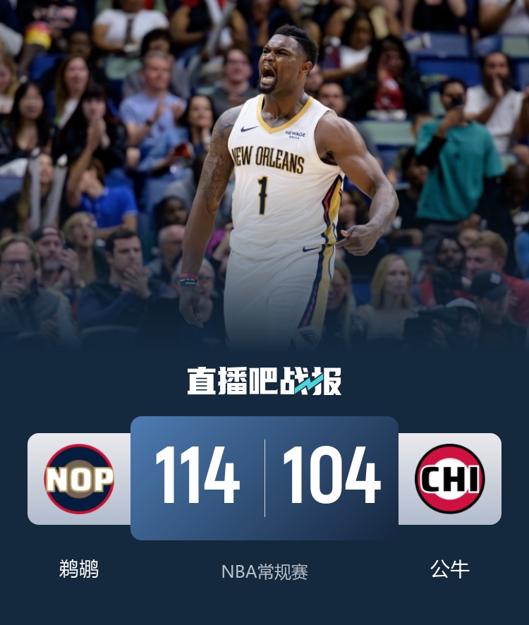 开场后两队节奏都打得比较快,公牛多点开花抢占先机,并且在外线率先打开局面命中三分,鹈鹕及时找到手感做出回应,锡安替补登场也在进攻端尝试单打。第二节上来琼斯接连拿分帮助鹈鹕完成反超,锡安重新登场后也在进攻端表现活跃,鹈鹕逐渐打出攻势建立领先。易边再战,鹈鹕延续上半场的攻势上来打出10-3将分差拉大到两位数,随后吉迪和怀特先后站出来为公牛追分,公牛一波14-0的反扑完成反超,鹈鹕四记罚球保住1分优势进入第四节。末节决战前半节两队还打得比较胶着,费尔斯接连拿分带领鹈鹕打出攻势,随后鹈鹕再度建立起两位数领先,公牛无力回天,最终鹈鹕114-104击败公牛,取得2连胜。