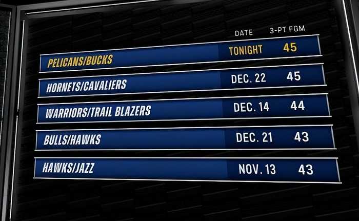 本场比赛雄鹿三分47中21,鹈鹕46中24,双方合计命中45记三分,平本赛季单场最多。