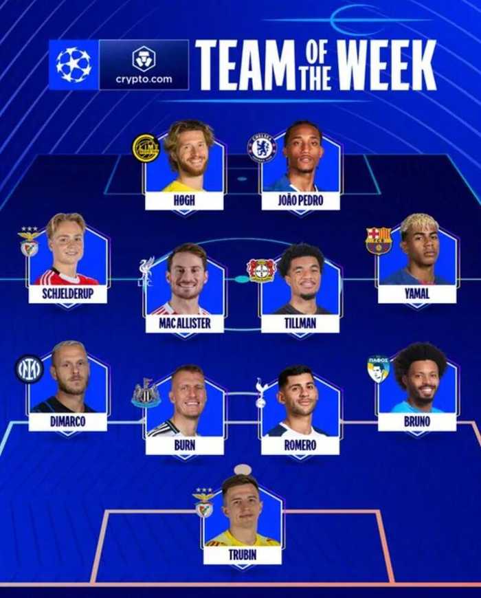 欧冠官方公布本轮最佳阵容,特鲁宾、霍格等11人入选